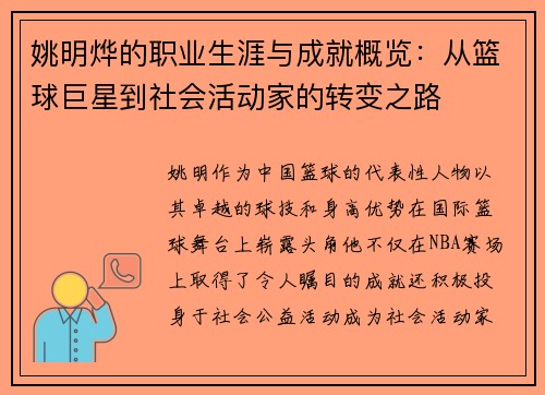 姚明,这位在篮球历史上占据重要地位的巨人,不仅以其卓越的球技和出色的运动表现闻名,更以其坚韧不拔的精神和积极向上的人生观影响着无数人。在一张展现他肩膀的照片中,姚明那宽广而有力的肩膀不仅承载了他辉煌的职业生涯,也象征着一种永不放弃、勇往直前的运动员精神。本文将从四个方面深入探讨姚明肩膀照片所传达出的巨人风范与运动员坚韧精神,包括他的身高与力量、奋斗历程中的挑战、对篮球事业的奉献以及对社会的影响与责...