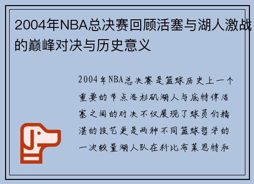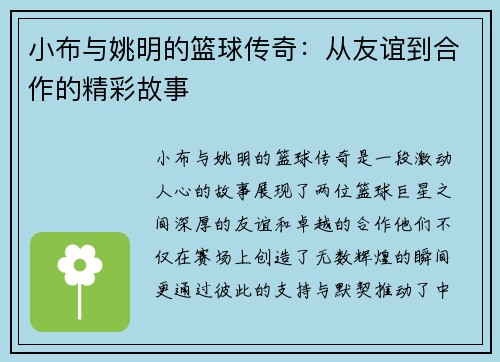 皮尔斯作为姚明的队友,不仅在篮球场上展现了卓越的技术与战术智慧,更以其不屈的精神和传奇生涯为无数球迷所铭记。本文将从四个方面深入探讨皮尔斯的传奇篮球生涯及其不屈精神是如何与姚明的合作相互辉映,形成完美结合的。从职业生涯初期的发展到巅峰时刻的辉煌,再到退役后的影响力,最后将结合他对年轻一代球员的激励作用,全面呈现皮尔斯如何通过自己的努力与奋斗,实现篮球梦想,并将这种精神传递给更多人。 1、初露锋芒...