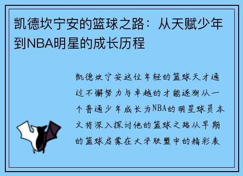 克林特・卡佩拉,这位来自瑞士的篮球运动员,以其卓越的篮板能力和逐渐成熟的技术,迅速在NBA舞台上崭露头角。自2014年进入联盟以来,他经历了从一名新秀到如今成为篮板王的蜕变。这篇文章将深入探讨克林特・卡佩拉的发展历程,分析他的职业生涯、技术特点、团队贡献以及未来展望。通过对这四个方面的详细解析,我们将更好地理解这位年轻球员如何在竞争激烈的NBA中脱颖而出,并为他的未来发展提供前瞻性的见解。 1、...